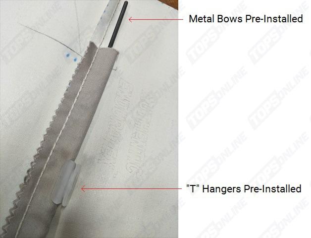 These headliners include pre-installed T hangers to mimic the factory original method of suspending the headliner from the roof. The headliners ship with the metal bows and T hangers pre-installed; your headliner will arrive ready to be installed. T hangers get suspended from the roof via the pre-existing holes in the interior roof specifically for the T hangers; no other parts are needed.