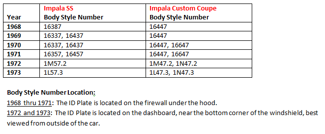 The 1968 thru 1973 Impala Sport and Custom Coupe were similar models, however, their headliners are not interchangeable. Because we want you to get the headliner which is a perfect fit for your car, we ask that you please provide the Body Style Number for your car. The information on the Body Style Info tab explains how to find the Body Style Number to identify your Impala with certainty.