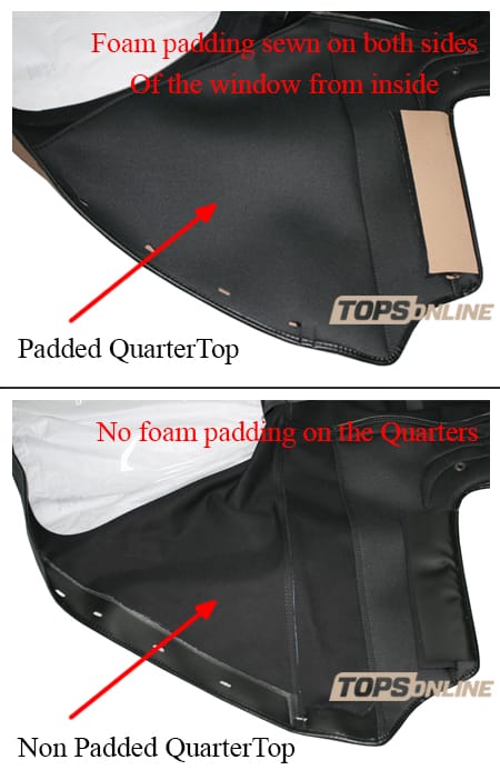 Factory style Convertible Top with Plastic window. We offer this Top with & without Padded Quarters, Tops are interchangeable, Please click on Yellow Top Quarter Picture Tab to see Non-Padded and Padded Quarter pictures. Top fits both Left & Right hand drive models. Other colors can be ordered, please inquire.