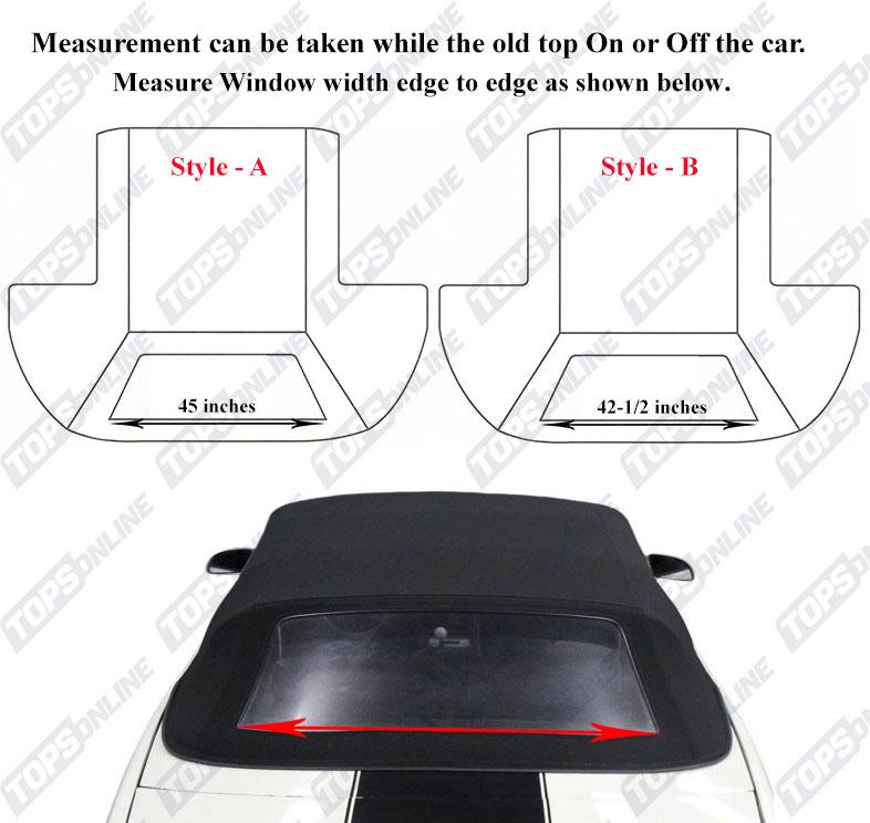 These cars came with 2 different size Tops from the factory, please click on Yellow Convertible Top Window Measurements Tab to see the measurements of each Top and order accordingly. Factory material is the Haartz Stayfast Cloth. Other colors can be ordered, please inquire.