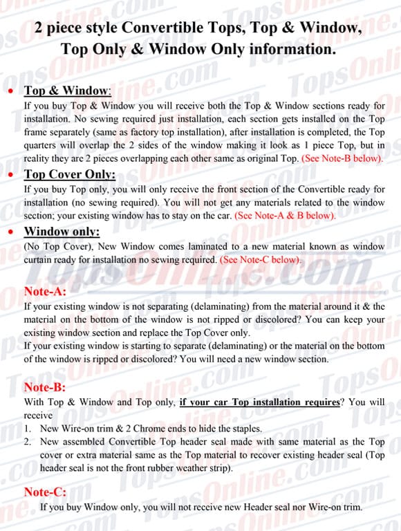 Factory style 2-piece Convertible Top with Window. Convertible Tops and Windows have alignment marks to make installation easier. Included with the Top, assembled front Header-seal (front Header-seal is not the front Rubber seal). We offer original style Top with Glass window & Non-original style Top with Plastic window.