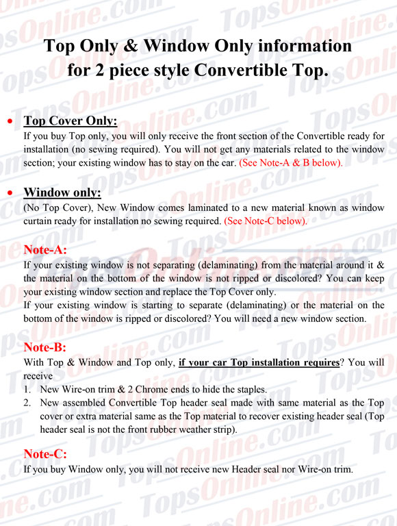 This is a factory style convertible top rear Defroster / Heated Glass window section, the rear part of the 2-piece convertible top used by the factory for 1996 through 2000 Sebring Convertibles. You will receive a new window laminated to a new material known as window curtain ready for installation (no sewing required). You will keep your existing Top cover. The Window section has alignment marks to make installation easier.