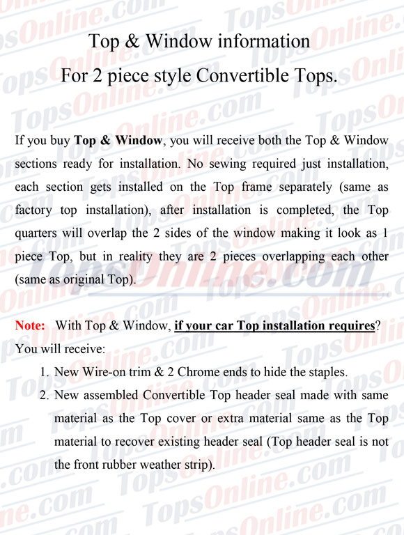 If you buy Convertible Top with Window, you will receive both the Top & Window sections (complete outside cover) ready for installation. No sewing required just installation, each section installs on the Top frame separately same as factory Top.