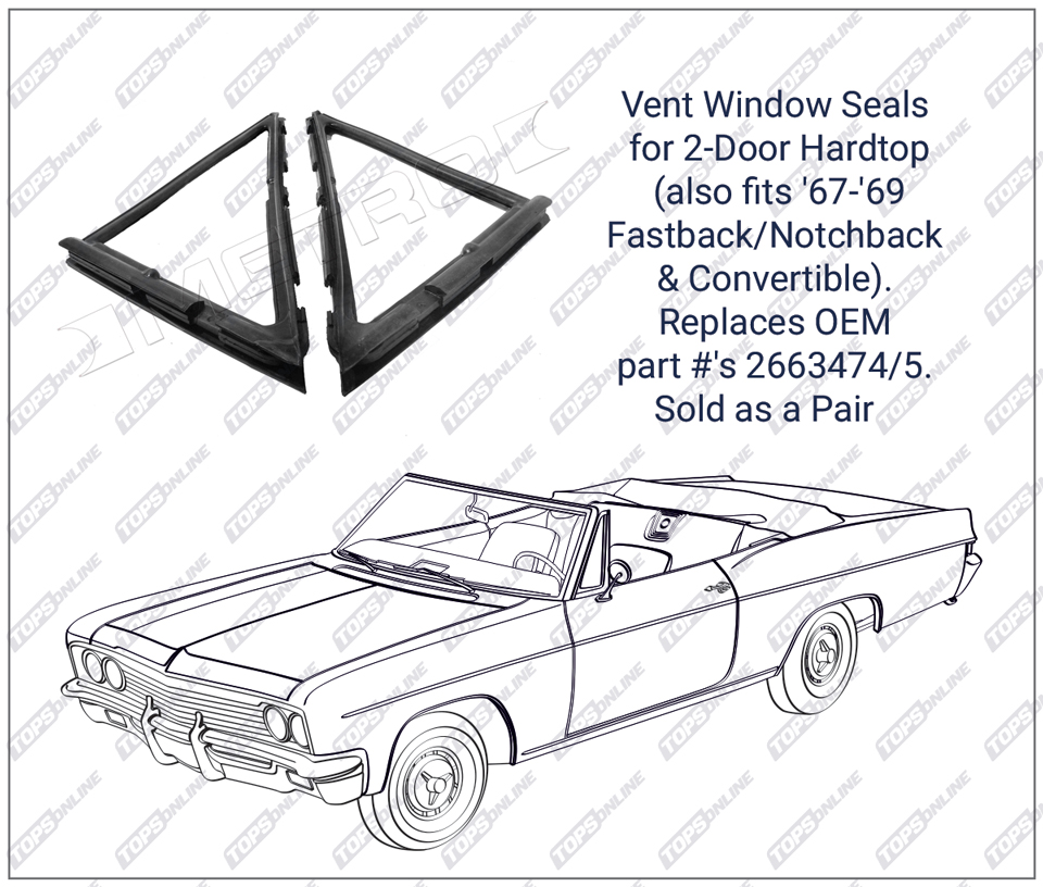 Vent window seals seal the edge of the front vent window frame to the body, helping to minimize air and moisture leaks while maintaining proper window movement and reducing rattles on your classic hardtop fastback.