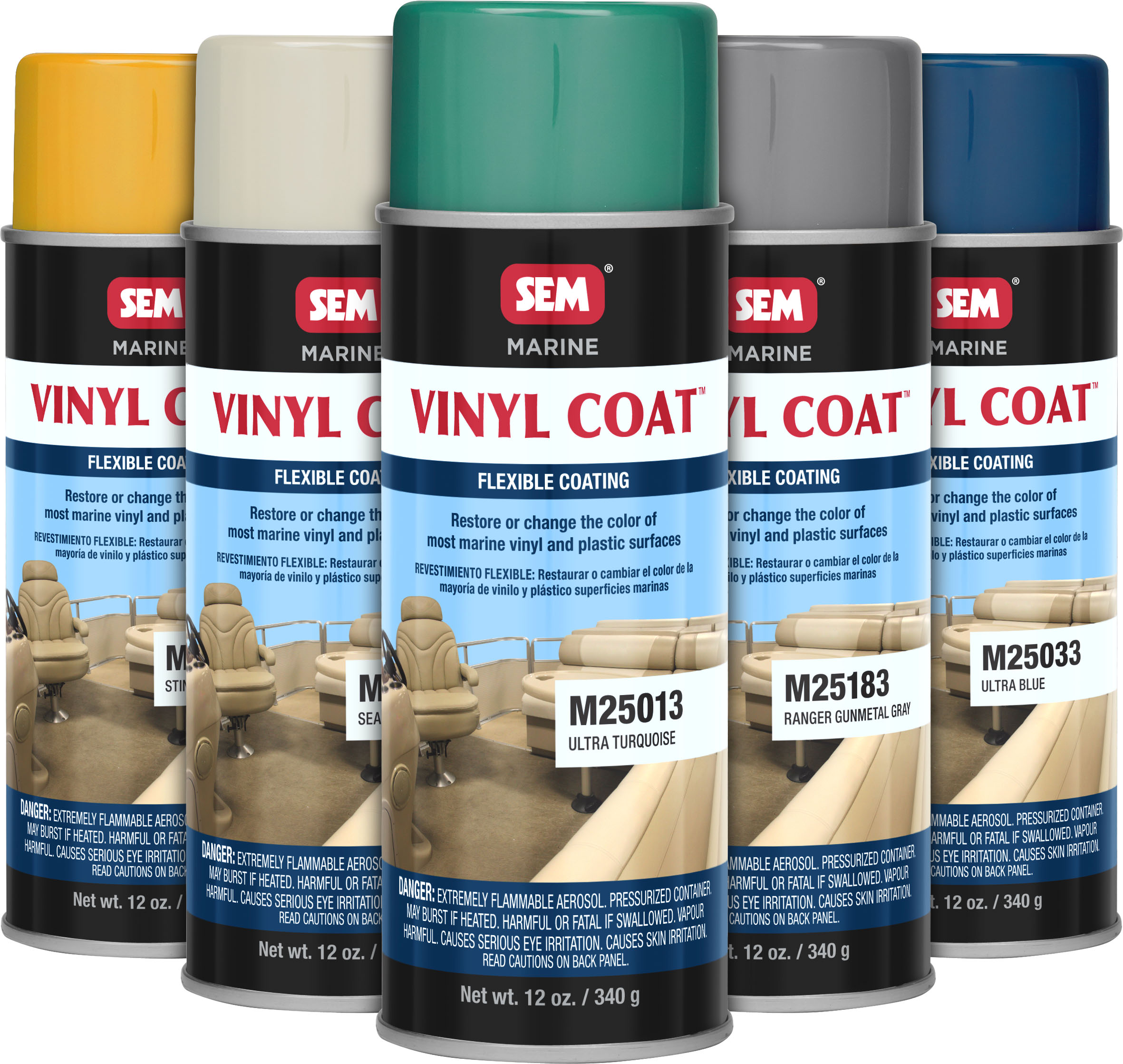 SEM Marine Vinyl Coat is available in 12 oz Aerosol Cans and each can covers approximately 10 square feet.